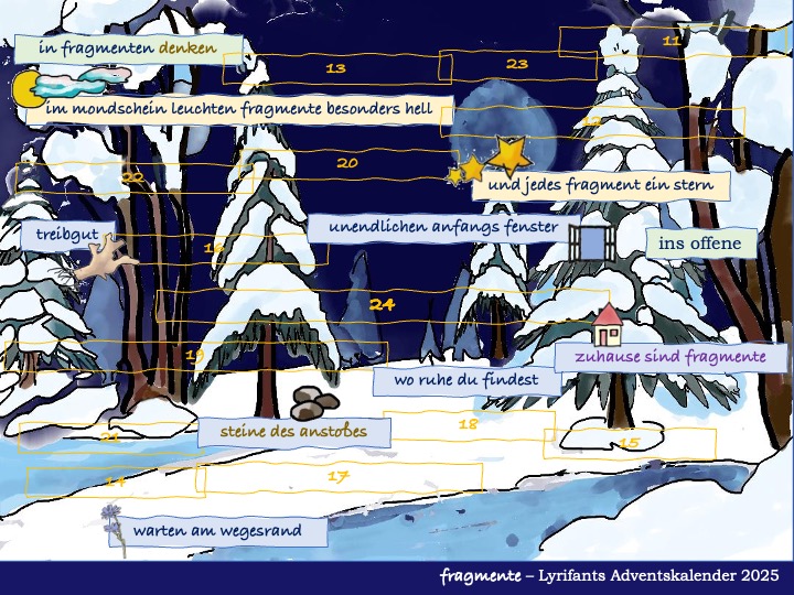 Mit diesem ersten Bruchstück beginnt Lyrifants Adventskalender 2025 – er ist ein bisschen verschroben (wie seine Urheberin 😉): ein Experiment, ganz im Geiste der Romantik, ein ‚progressiv-universalpoetisches‘ Sprachspiel, eine Liebeserklärung an das Fragment und seine poetische Kraft. Lasst Euch überraschen – doch vor allem: Habt eine schöne, poetisch erfüllte Adventszeit!