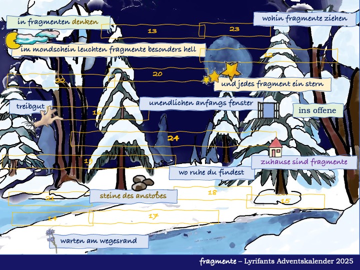 …wenn wir sie lassen – loslassen – ist manchmal das Wohin nicht wichtig Das sieht schon richtig viel als zusammengesetzter Text aus. Damit ist auch optisch klar, dass wir morgen die Hälfte erreicht haben. Im Bild wirkt es noch nicht so auf mich. Liebe Grüße, SyntaxiaSophie Antworten
