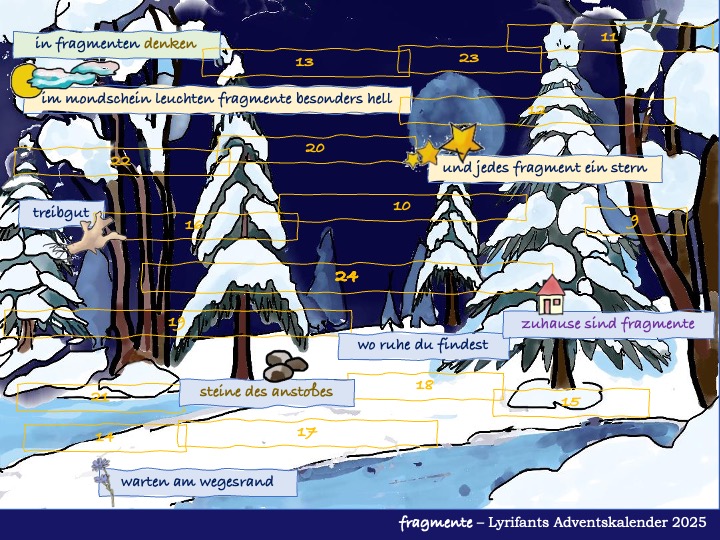 Mit diesem ersten Bruchstück beginnt Lyrifants Adventskalender 2025 – er ist ein bisschen verschroben (wie seine Urheberin 😉): ein Experiment, ganz im Geiste der Romantik, ein ‚progressiv-universalpoetisches‘ Sprachspiel, eine Liebeserklärung an das Fragment und seine poetische Kraft. Lasst Euch überraschen – doch vor allem: Habt eine schöne, poetisch erfüllte Adventszeit!