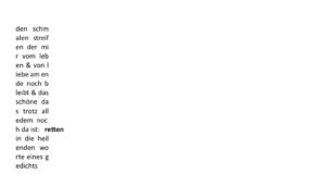 In seiner Form ist dieser Text inspiriert von „gedanken zerren“, dem Debüt-Gedichtband von Özlem Özgül Dündar, wobei ich die Form einerseits radikalisiert und andererseits aufgebrochen habe für eine Idee, die in mir gärte und die ich nun glaubte, mit diesem Format am besten umsetzen zu können. Das Potential dieser Form ist einfach klasse, weil diese gebrochene Sprache gleichzeitig so viel Ungesagtes mitschwingen lässt – eine echte Entdeckung!