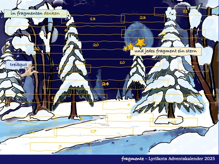 Mit diesem ersten Bruchstück beginnt Lyrifants Adventskalender 2025 – er ist ein bisschen verschroben (wie seine Urheberin 😉): ein Experiment, ganz im Geiste der Romantik, ein ‚progressiv-universalpoetisches‘ Sprachspiel, eine Liebeserklärung an das Fragment und seine poetische Kraft. Lasst Euch überraschen – doch vor allem: Habt eine schöne, poetisch erfüllte Adventszeit!