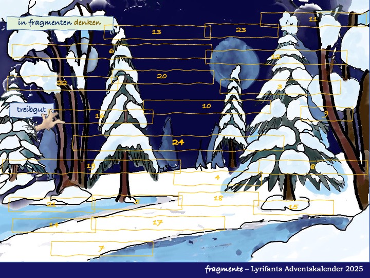 Mit diesem ersten Bruchstück beginnt Lyrifants Adventskalender 2025 – er ist ein bisschen verschroben (wie seine Urheberin 😉): ein Experiment, ganz im Geiste der Romantik, ein ‚progressiv-universalpoetisches‘ Sprachspiel, eine Liebeserklärung an das Fragment und seine poetische Kraft. Lasst Euch überraschen – doch vor allem: Habt eine schöne, poetisch erfüllte Adventszeit!